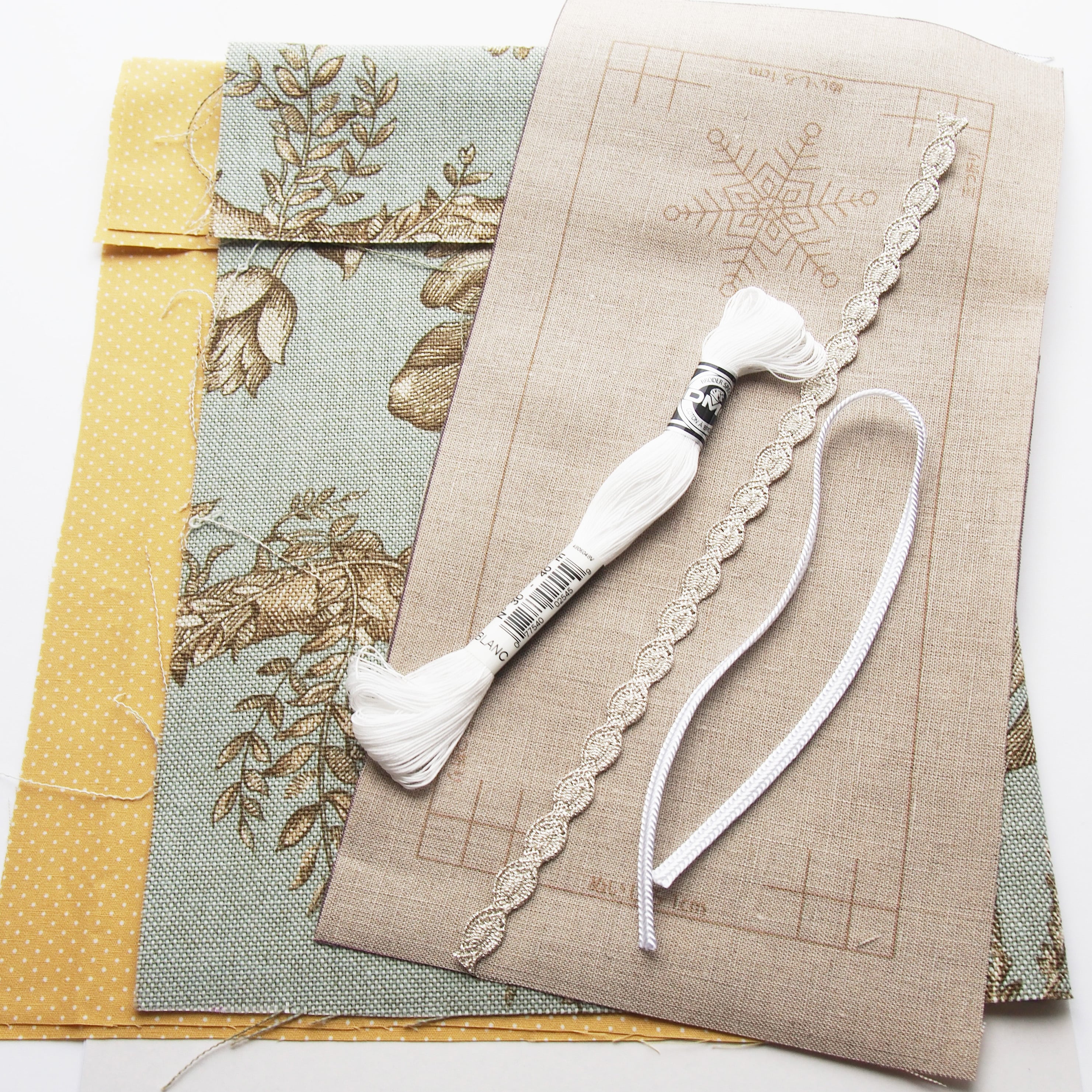 キット内容:刺繍部分の布/図案プリント済(リネン)、本体表布、本体裏布、針、アブローダ、コード、説明書